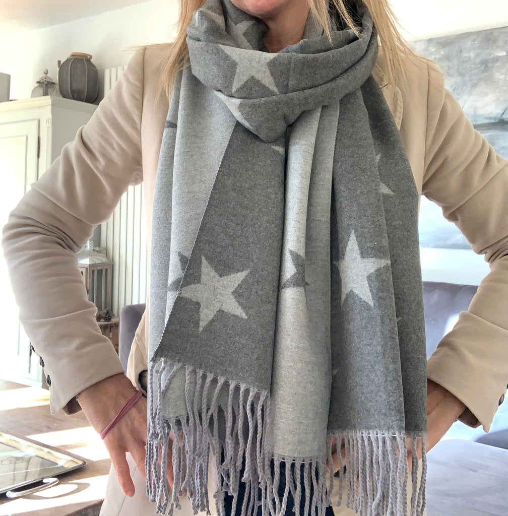 Getting you ready for winter with our new beautifully soft large scarf with stars. Fully reversible, so wear either side or both colours together. Feels soft as cashmere.