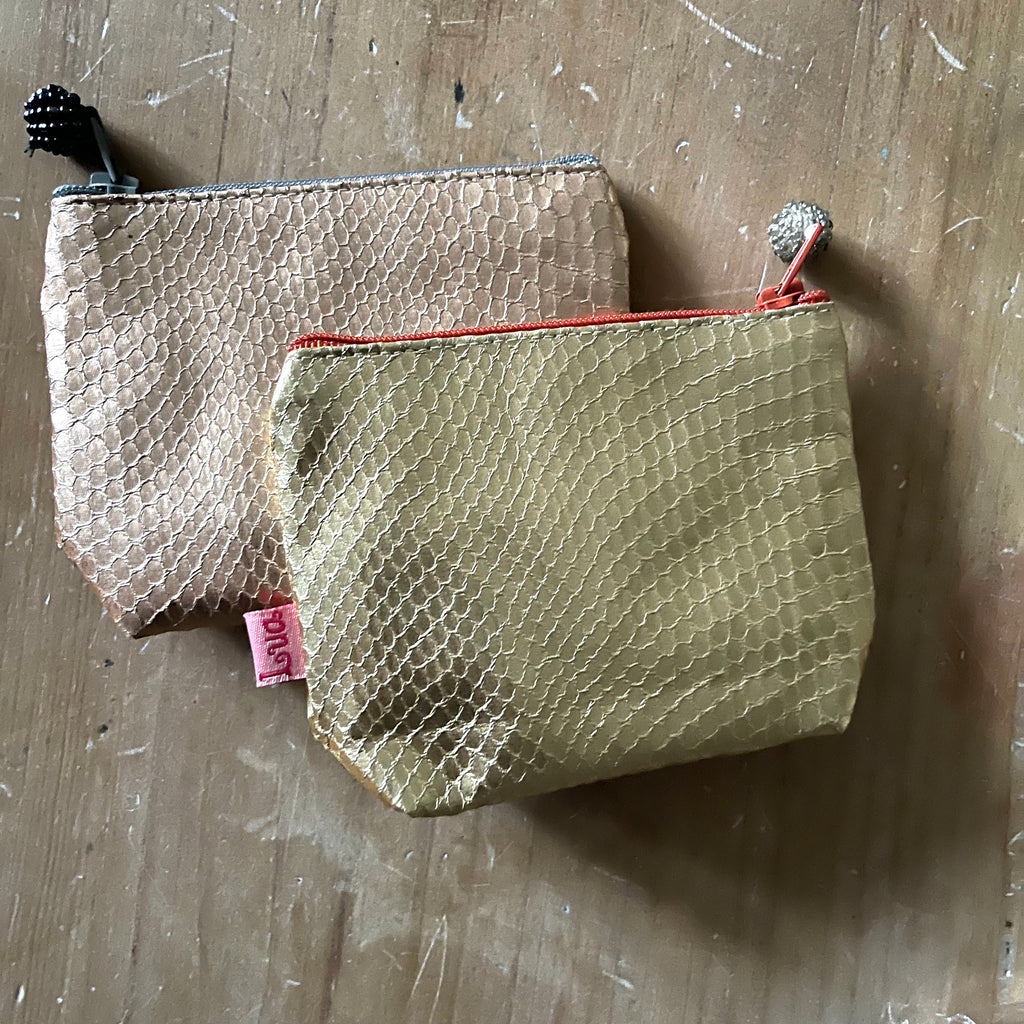 Luxurious metallic makeup bag and coin purse. Satin lined with contrasting zips and pretty beaded zip pull. Perfect for a handbag.